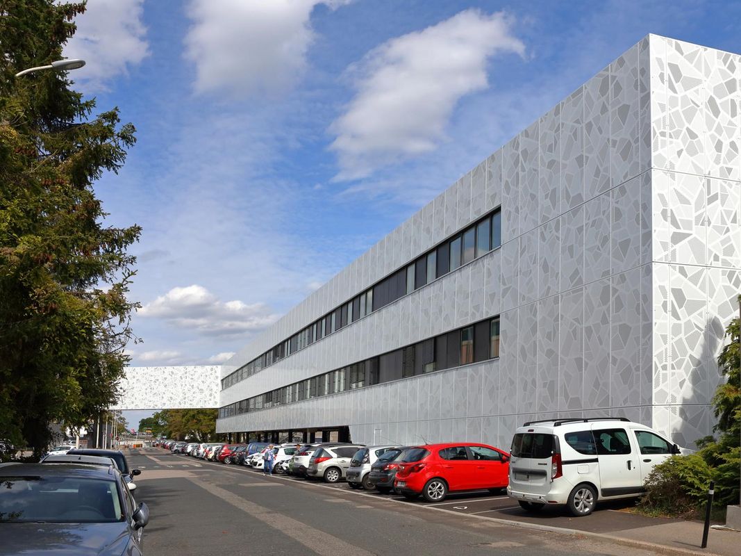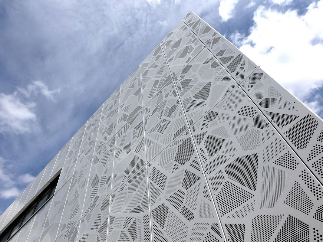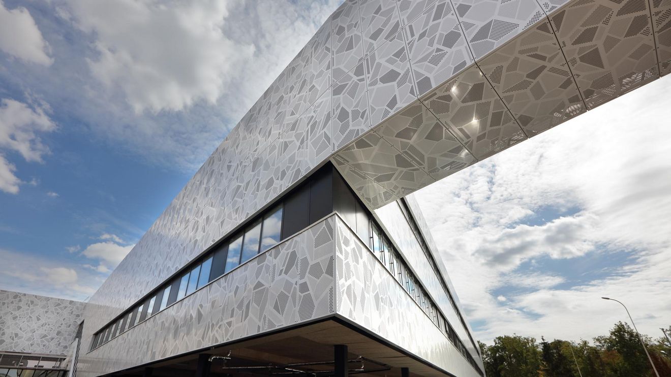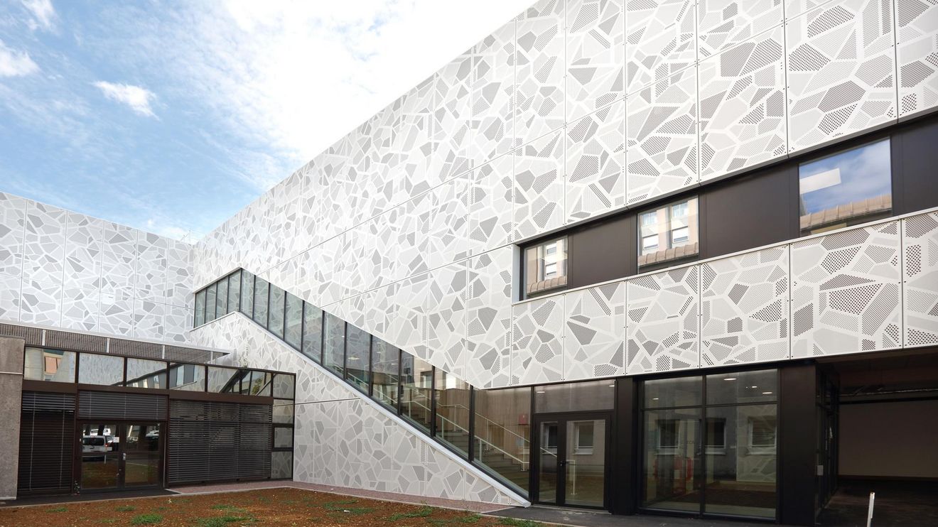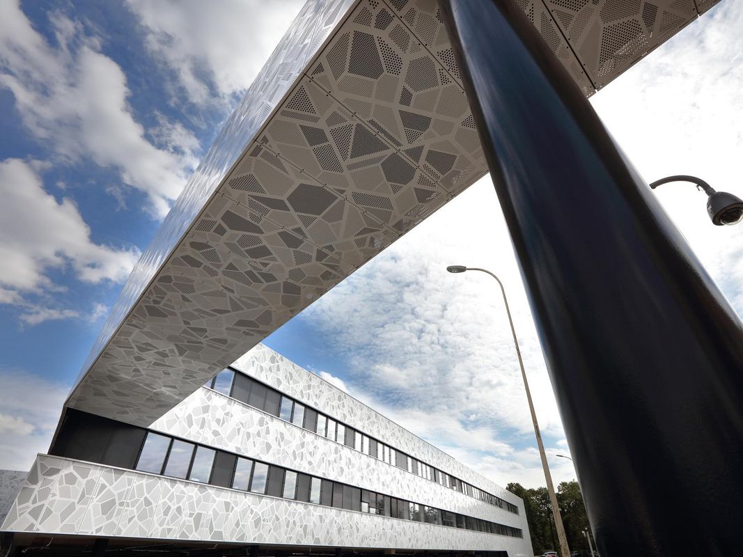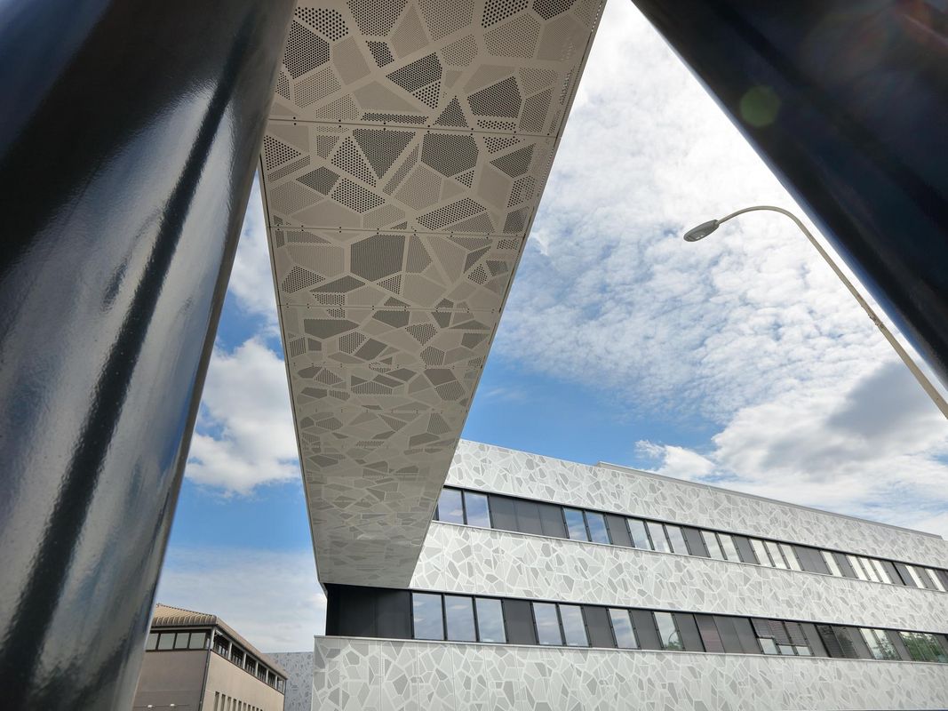 Die Fassade des Gebäudes wurde mit 2.000 m² Lochblech aus 3 mm pulverbeschichtetem Aluminium verkleidet. Das individuelle Lochmuster ist inspiriert von biologischen Zellstrukturen und visualisiert damit symbolisch den medizinischen Schwerpunkt des Gebäudes – eine gestalterisch wie inhaltlich durchdachte Lösung.